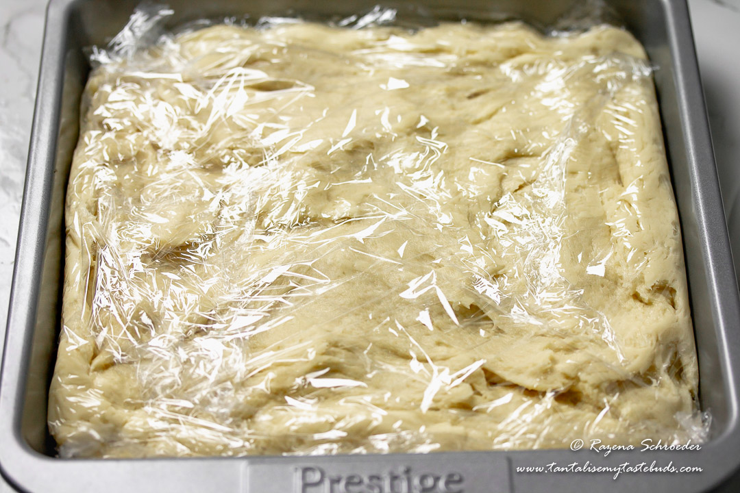 • Line a square or rectangular baking tin or container with cling film and tip the dough into it, ensuring all dough surfaces are covered so that they don't dry out. The cling film will help to release the dough from the container once it has chilled.