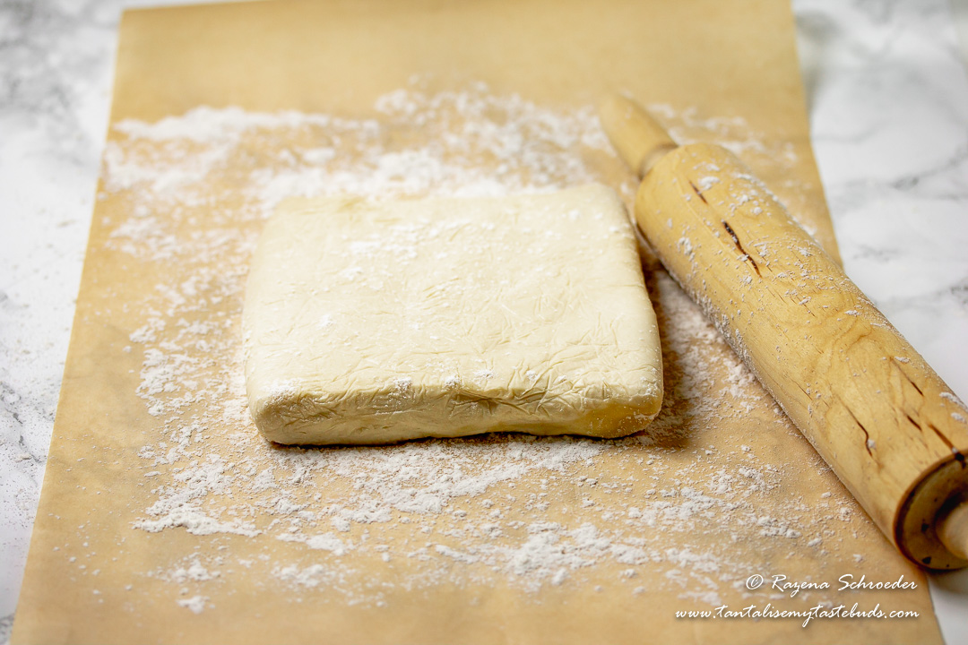 • Dust a clean work surface with cake flour and place the square of dough in the center. Also lightly dust the rolling pin and the top of the dough.