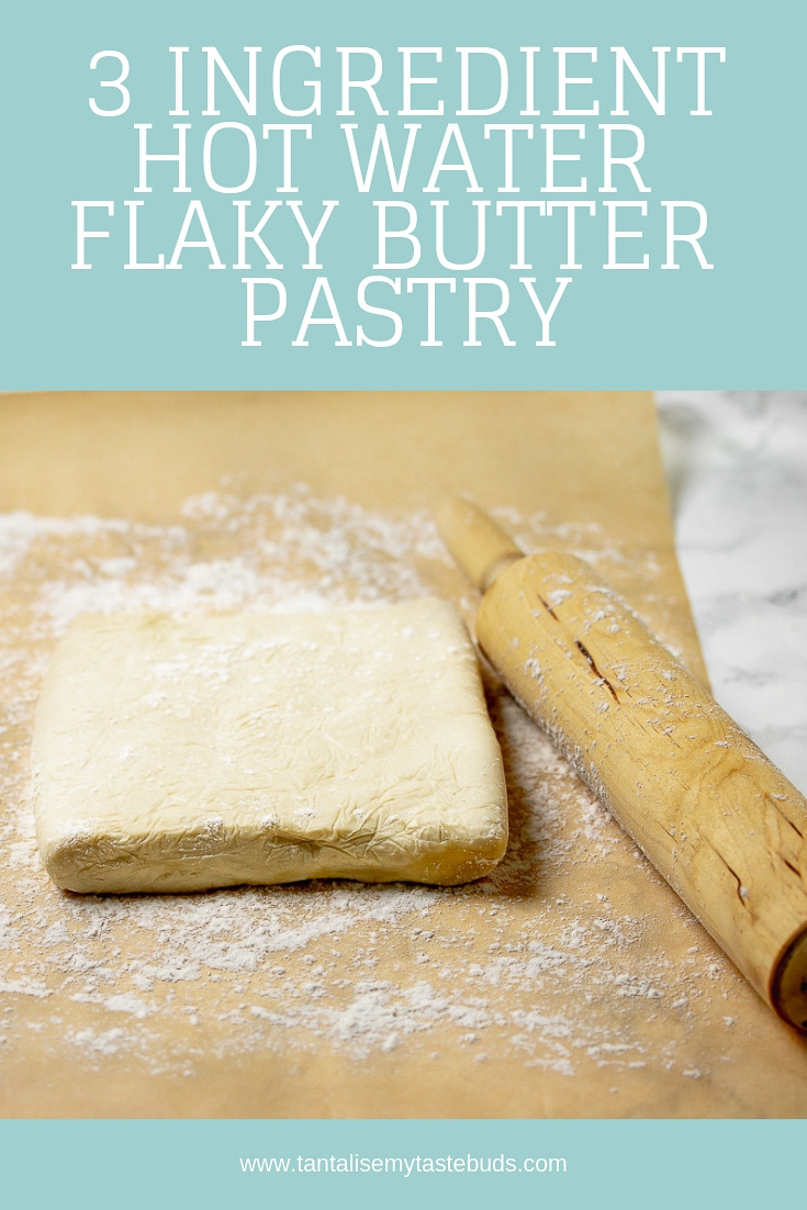 This quick and easy home made 3 ingredient Hot Water Flaky Butter Pastry is tender and buttery and the perfect crust for a rich savory pie or appetisers.