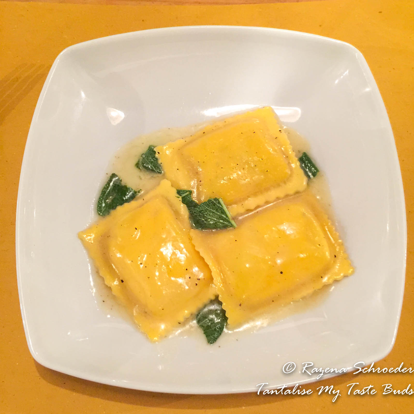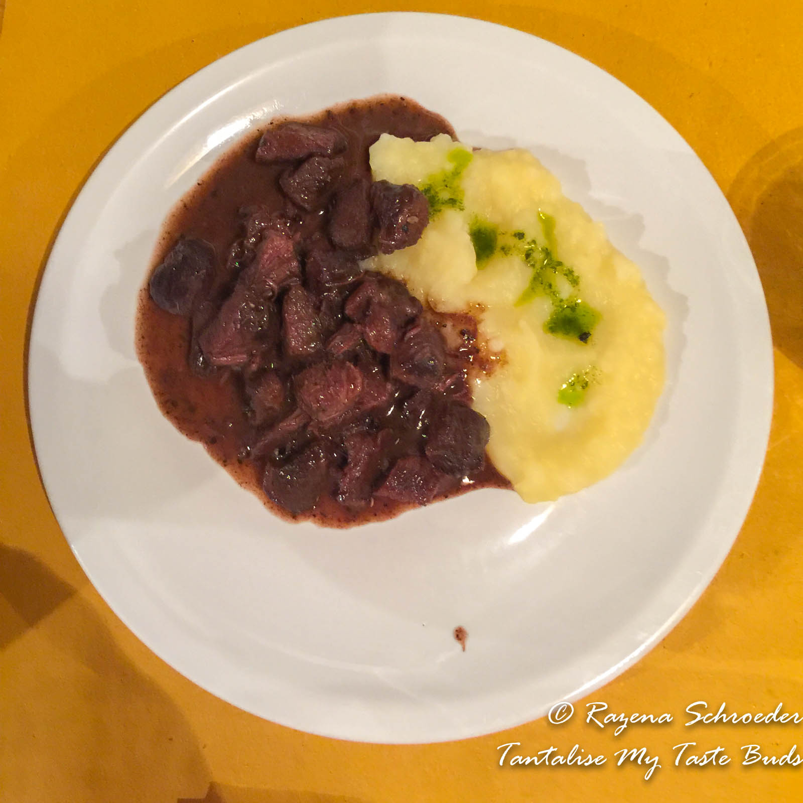 The first dish was a hearty Tuscan bread and tomato soup called Pappa col Pomedoro. It was surprisingly light and tasty. The other members of the group had a peppery beef stew called Peposa alla Fornacina. I had potato stuffed tortelli that defies description. It was presented simply with a sage butter dressing but the flavour and texture blew me away and it was my favourite dish of the tour.