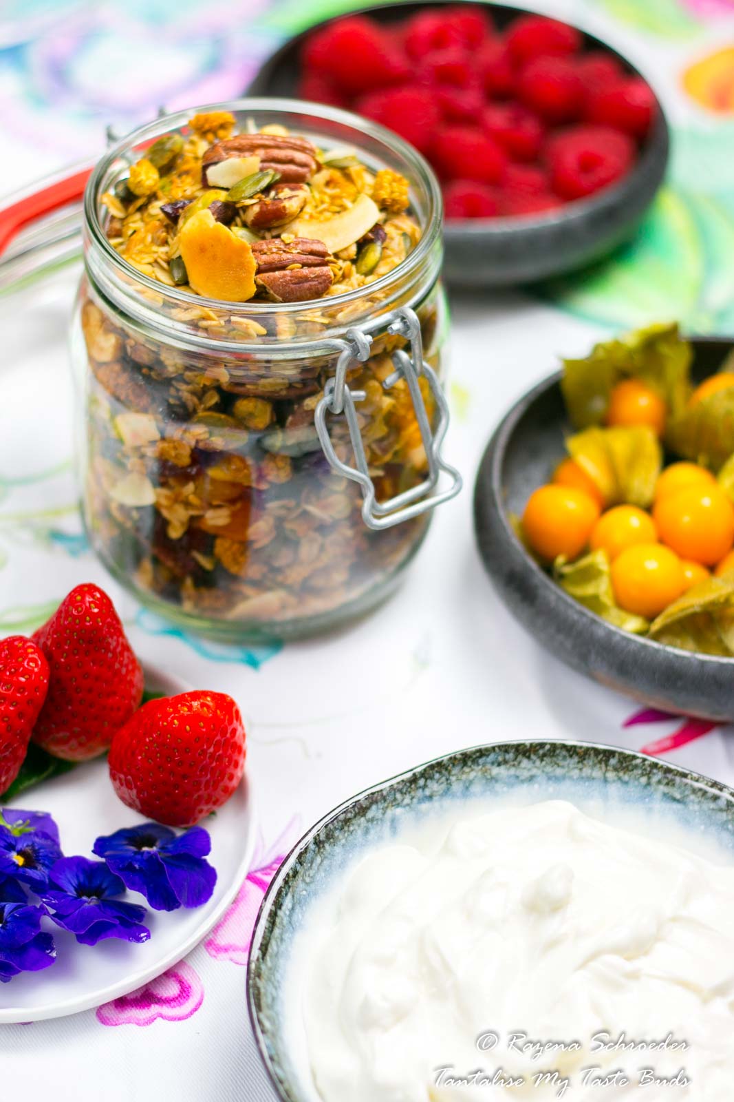 Any granola or muesli with nuts, seeds and dried fruits can be used. The berries and edible flowers can be substituted with any other cut seasonal fruits. If the fruits are not very sweet, drizzle over a teaspoon of honey (optional)